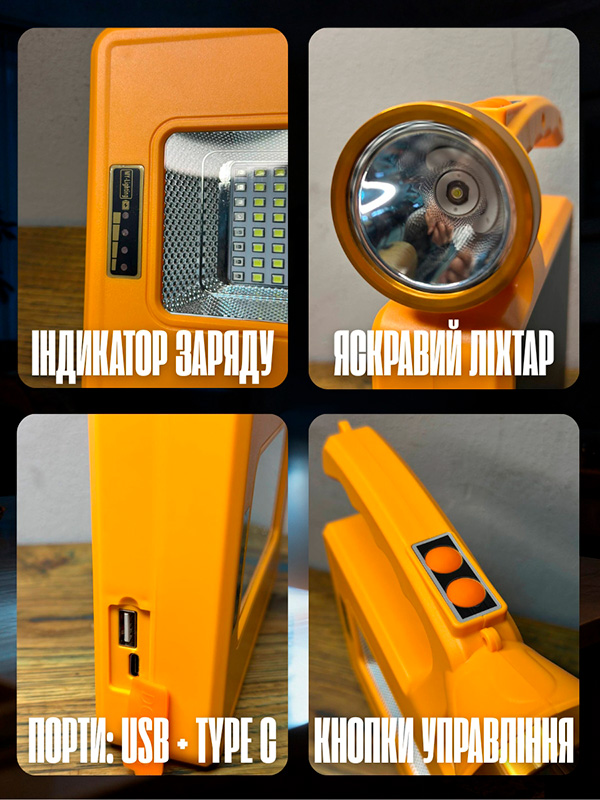 Акумулятора вистачає до 8 годин роботи! Для заряджання телефонів або інших ґаджетів у наборі є 2 найпоширеніші роз'єми USB + Type C. Також варто зазначити зручний і міцний корпус, який захищає ліхтар від пошкоджень.
