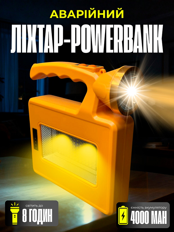 Акумулятора вистачає до 8 годин роботи! Для заряджання телефонів або інших ґаджетів у наборі є 2 найпоширеніші роз'єми USB + Type C. Також варто зазначити зручний і міцний корпус, який захищає ліхтар від пошкоджень.
